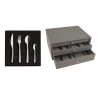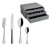 La collection de couverts MIRAGE de DEGRENNE offre un registre de forme moderne et épuré. Le design rectiligne et minimaliste met l’accent sur l’originalité des couteaux, disponibles en deux versions. La forme innovante des couteaux n°1 permet de garder une face totalement lisse, sans aucune aspérité visuelle, pour des tables originales au caractère unique. Les proportions modernes des couteaux n°2 sont plus consensuelles sans perdre leur design minimaliste particulier. En acier inoxydable 18-10, de haute qualité et résistance, ils sont faciles d’entretien. Le colis-écrin 100 pièces est constituée de 12 fourchettes de table, 12 cuillères de table, 12 couteaux de table, 12 cuillères à café, 12 fourchettes à gâteaux, 12 fourchettes à dessert, 12 couteaux à dessert, 12 cuillères à dessert, 1 cuillère de service, 1 fourchette de service, 1 pelle a tarte et 1 louche dans un coffre de rangement 3 tiroirs.