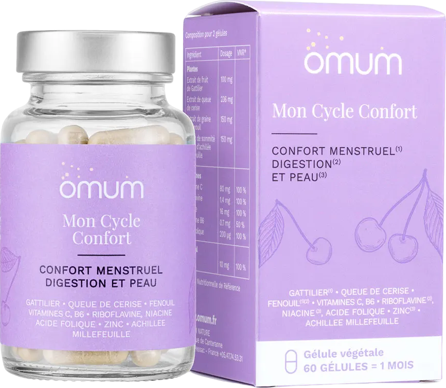 Découvrez **Mon Cycle Confort** d’Omum, votre allié pour des cycles menstruels apaisés. Formulé à base de plantes bio, minéraux et probiotiques, ce complément soutient le confort menstruel, favorise une digestion harmonieuse et améliore l’éclat de la peau. 100% naturel, vegan et fabriqué en France, il répond aux besoins des femmes, en respectant leur corps et leur bien-être au quotidien. Transformez vos cycles en une expérience plus sereine avec ce soin complet et bienveillant.