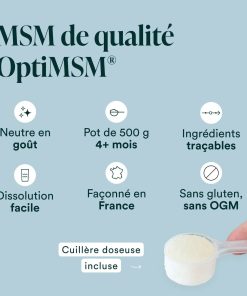 100% OptiMSM® (méthyl-sulfonyl-méthane) en poudre, naturellement concentré en soufre biodisponible. Forme brevetée ultra pure de MSM.