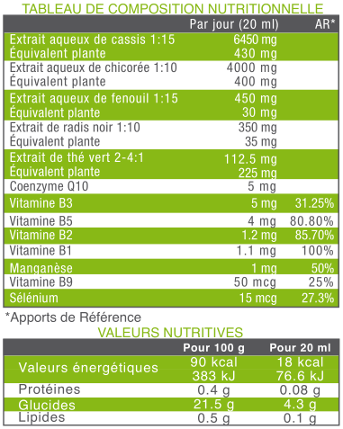 Extrait aqueux de cassis, extrait aqueux de chicorée, fructose, eau, extrait de fenouil, arôme fruits de la passion, extrait aqueux de radis noir, extrait de thé vert titré à 55 % de polyphénols, 5 % de caféine, 15 % d’EGCG et 30 % de catéchine, acidifiant : acide citrique, conservateurs : benzoate de sodium, sorbate de potassium, levure de sélénium, vitamines B5, B3, B2, B1, B9, sulfate de manganèse, coenzyme Q10, édulcorant : glycosides de stéviol.