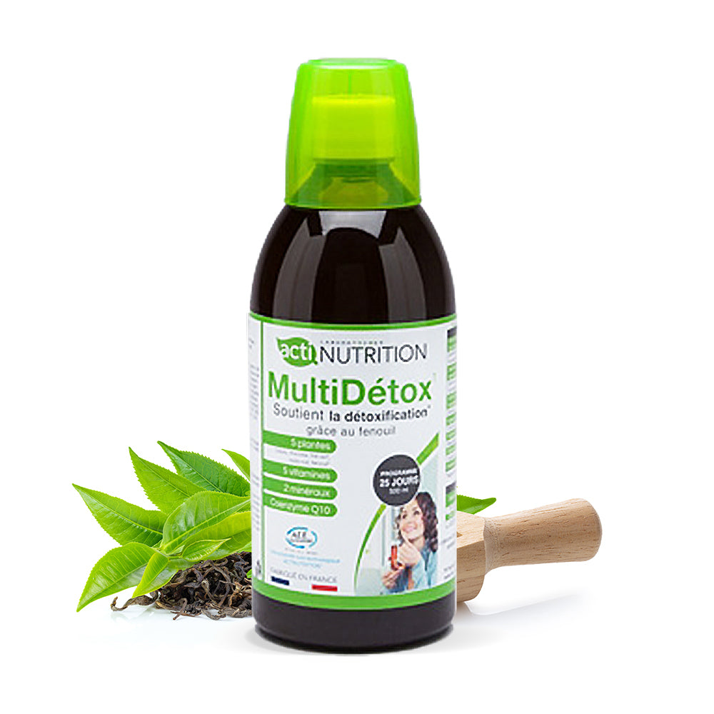 Actinutrition® MultiDétox est un complément alimentaire fabriqué en France sous forme de draineur minceur de 500 ml avec bouchon doseur à diluer dans de l’eau qui allie détoxication et élimination de l’eau en excès.