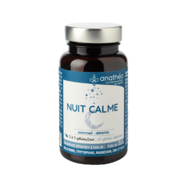 Nuit Calme d’Anathéa est une solution naturelle conçue pour aider à retrouver un sommeil réparateur. Dans chaque boîte de 45 gélules, une formule unique combine des extraits de plantes réputées pour favoriser l’endormissement et réduire les réveils nocturnes, comme la mélisse, la camomille et la passiflore. Idéal pour les périodes de stress ou d’insomnie passagère, Nuit Calme vous aide à renouer avec des nuits paisibles, sans dépendance ni somnolence au réveil. Retrouvez un sommeil naturel avec Anathéa, votre allié bien-être.