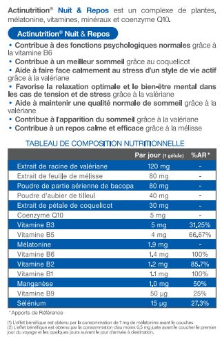 Actinutrition® Nuit & Repos Nouvelle formule est un complément alimentaire fabriqué en France sous forme d’une aide à l’endormissement à base de plantes, mélatonine, vitamines et minéraux et de coenzyme Q10 en gélules, pour toutes les personnes dont le sommeil est pertubé cherchant à se relaxer et maintenir une continuité du sommeil tout au long de la nuit.