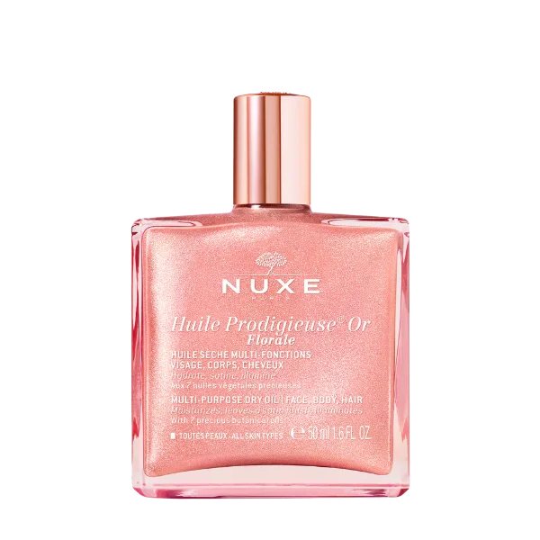 Cette huile sèche pailletée aux nacres d’origine naturelle offre un irrésistible éclat or rose irisé à tous les types de peaux. Elle hydrate, satine et illumine en un seul geste visage, corps et cheveux. Votre peau est sublimée, douce et soyeuse, sans fini gras.