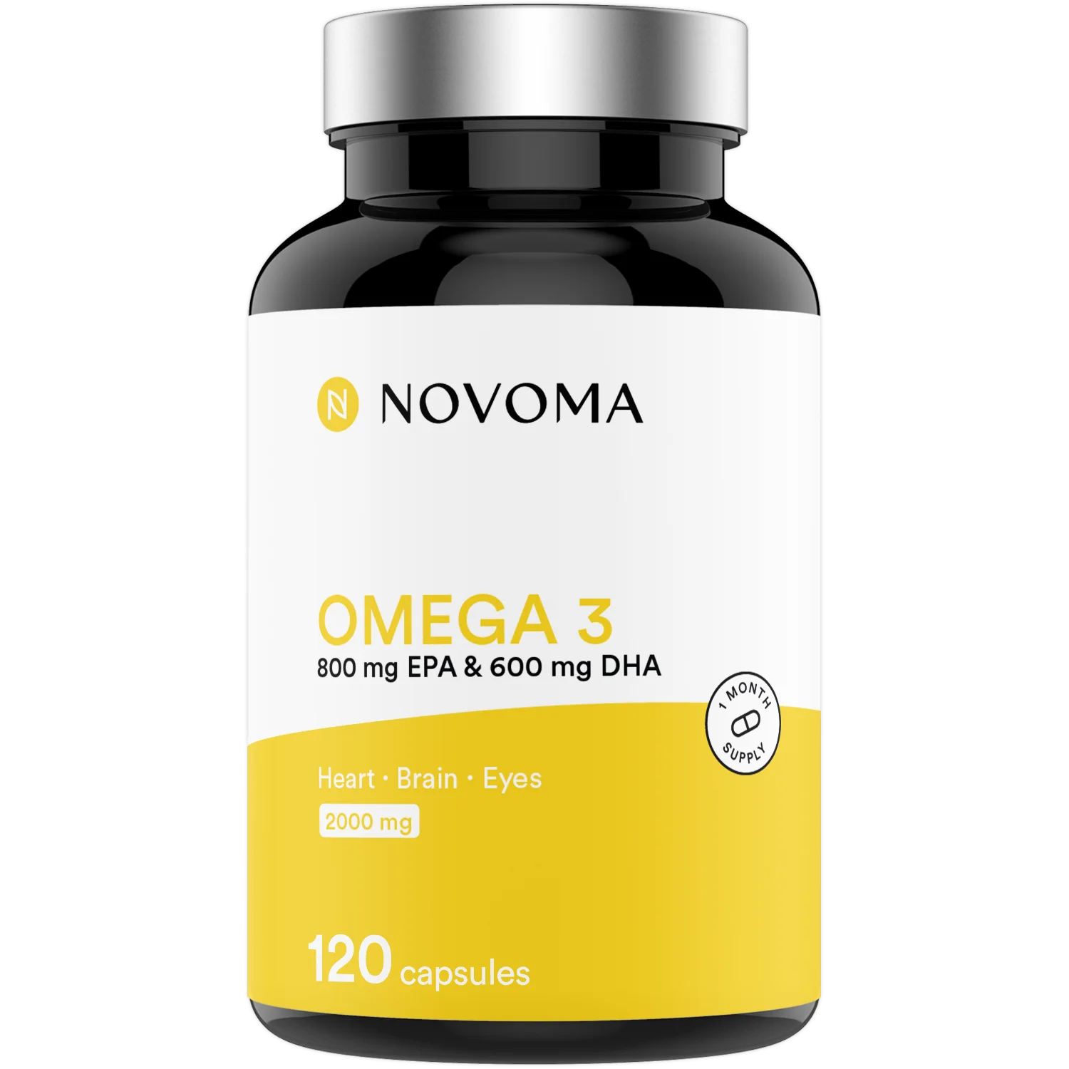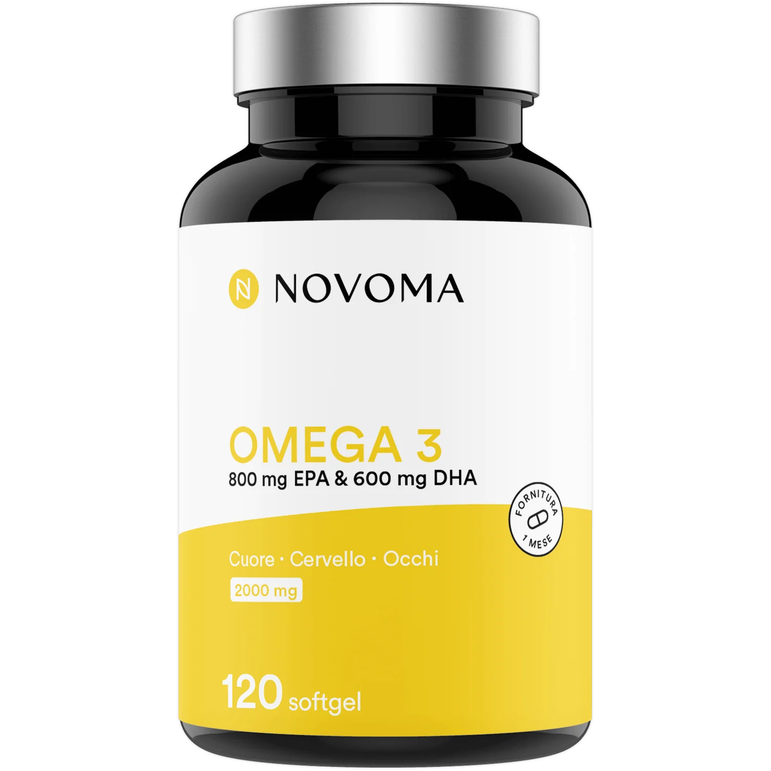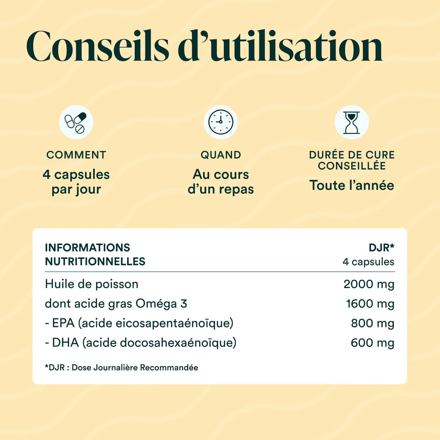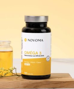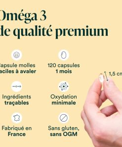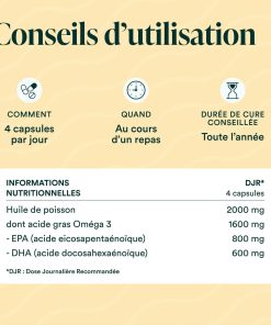 Huile de poisson ultra pure concentrée en acides gras essentiels oméga 3 (90% de triglycérides). 800 mg d’EPA et 600 mg de DHA par dose journalière (4 capsules).