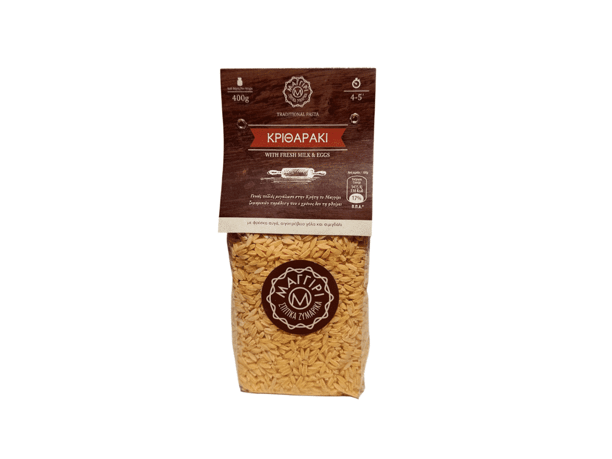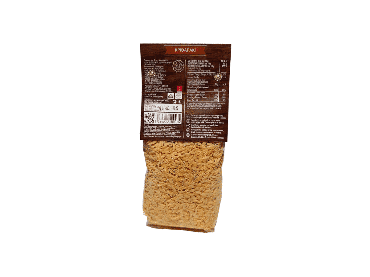 Fabriqué artisanalement en Crète par la maison Maggiri, cet orzo est produit avec des ingrédients locaux rigoureusement sélectionnés. Il ne contient ni conservateur, ni additif. Son goût subtil convient parfaitement à une cuisine saine, gourmande et équilibrée.