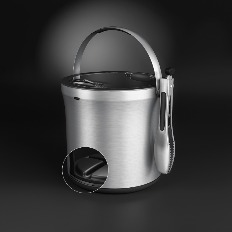 Pince à Glaçons Incluse Le seau à glace OXO est fourni avec une pince pratique pour prendre et servir les glaçons. Cette pince se fixe sur un petit embout prévu à cet effet sur le côté du seau, vous assurant de toujours l’avoir à portée de main.