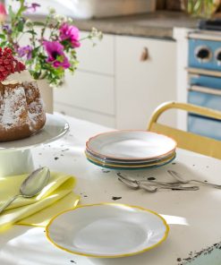 La maison DEGRENNE étend sa gamme REMINISCENCE sur de nouvelles couleurs pop et acidulées : orange, jaune et violet. Issues de formes délicieusement vintage, les assiettes festonnées évoquent des souvenirs de nos cuisines familiales et aussi de nos bistrots français favoris. Fabriquée en porcelaine extra blanche de Limoges, REMINISCENCE se transforme en une collection complètement actuelle grâce à ses galons colorés posés à la main. Les trois nouveaux coloris sont disponibles sur l’assiette de 26cm et sur l’assiette à dessert de 19cm et rejoignent le coloris vert pour une collection mix & match moderne et colorée.