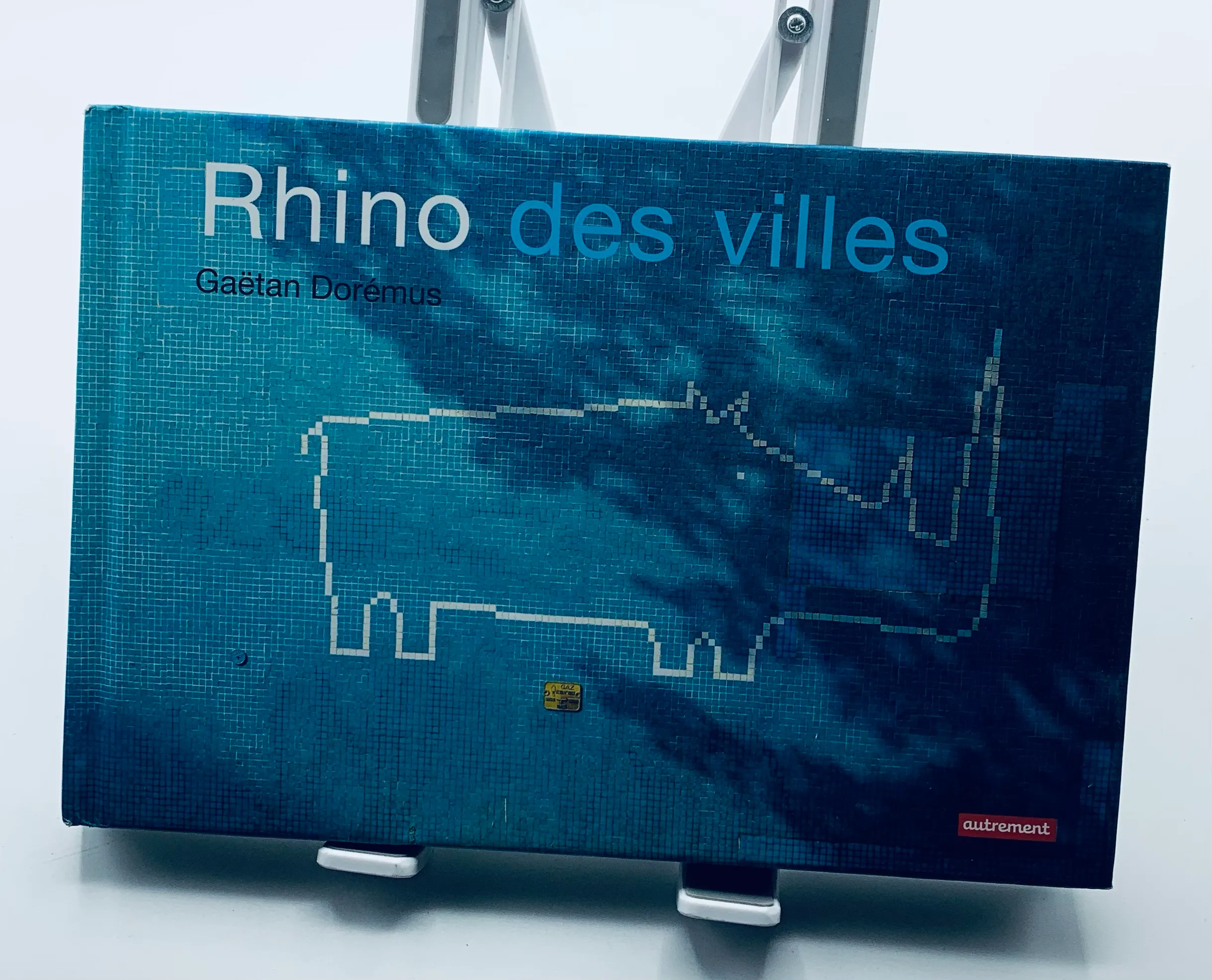 Les rhinocéros ont été chassé des villes, un seul spécimen y vit encore, Gaëtan Dorémus illustre la présence du dernier Rhinoceros par des photos du Rhino dans la ville avec différentes techniques ( collages, craie, Légo…)