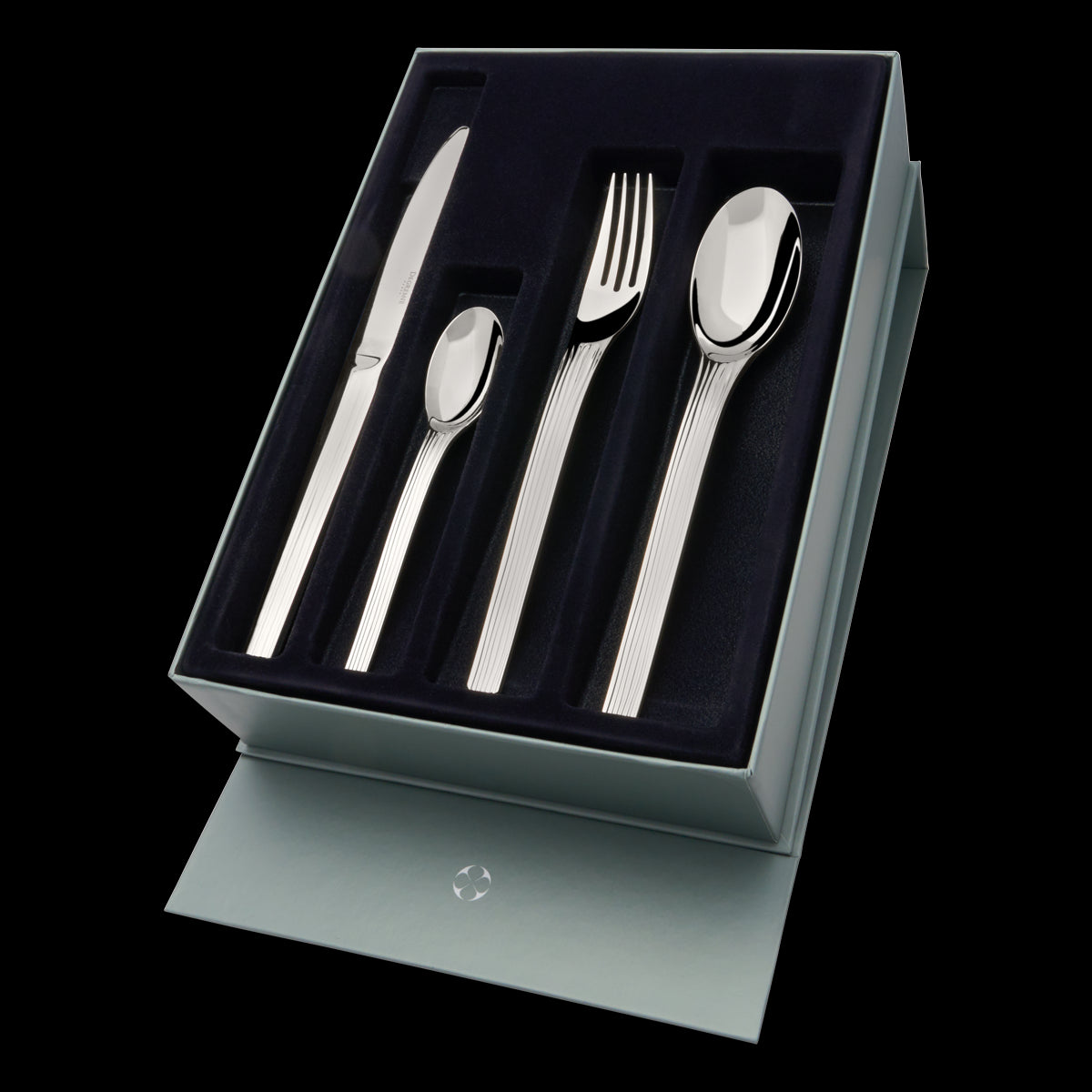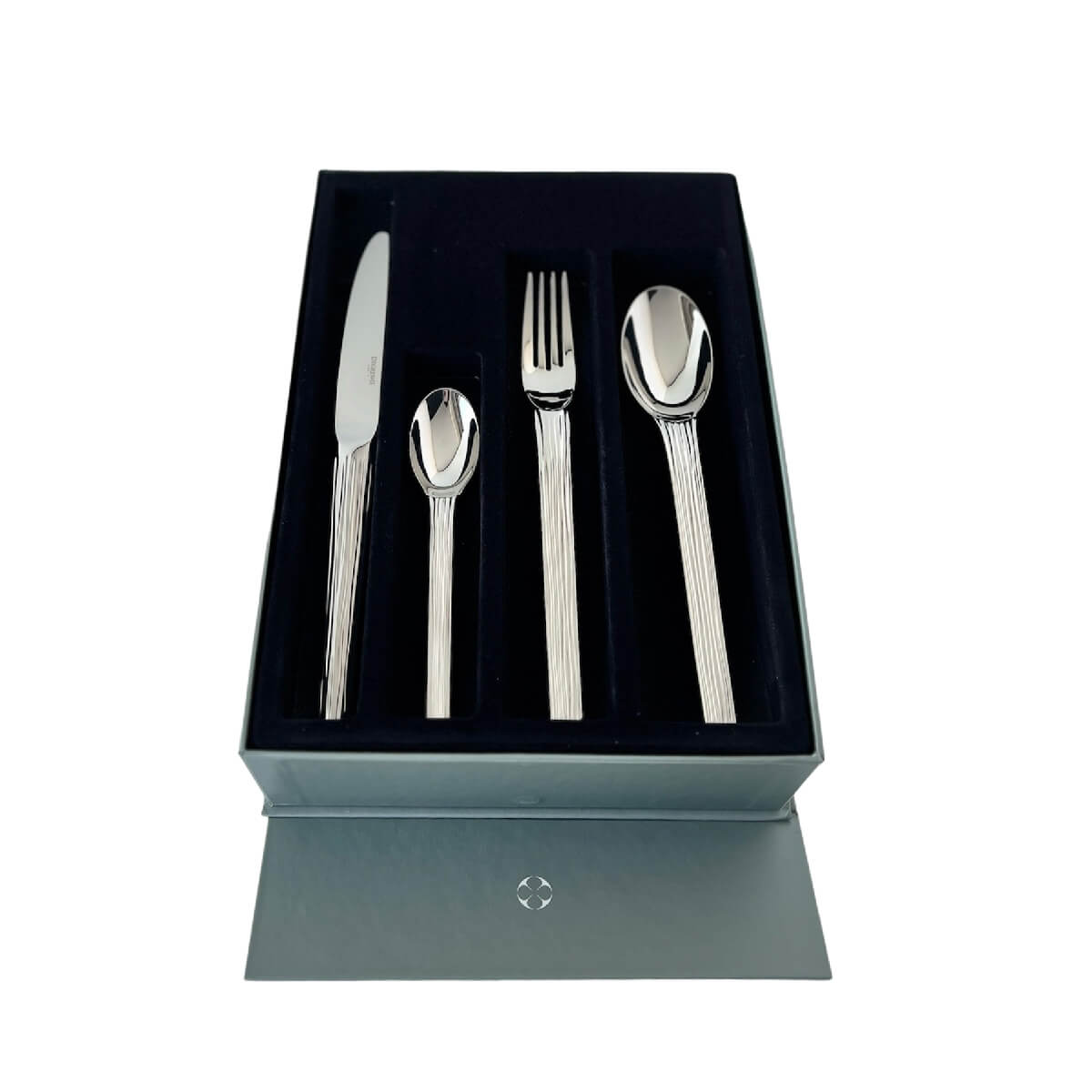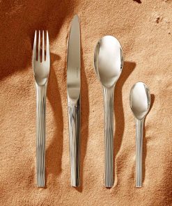 Des vagues caressant la rive aux sillons laissés par le vent dans le sable, la texture de RIVAGE s’interprète librement. Chaque fourchette, couteau, cuillère est délicatement sculptée pour offrir une prise en main agréable et naturelle qui résistera avec élégance aux marques du temps. Que vous serviez un plat raffiné ou un met plus simple, les couverts RIVAGE subliment votre vaisselle avec leur relief subtil et lumineux et apportent une touche originale et naturelle à votre table. Offrez-vous une expérience sensorielle unique et succombez à l’appel de ces délicates vagues d’argent.