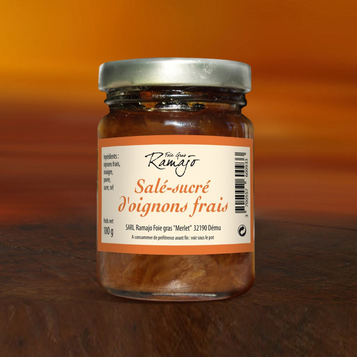 Le Salé-sucré d’oignon Maison Ramajo est un accompagnement artisanal conçu pour sublimer les produits du Sud-Ouest. À base d’oignons frais cuits avec du sucre, du vinaigre, du sel et du poivre, il mêle douceur fondante et légère acidité. Sa texture compotée et sa palette aromatique équilibrée en font un partenaire idéal des foies gras, des magrets et des viandes grillées. Une touche sucrée-salée qui révèle toute la finesse de la cuisine gasconne.