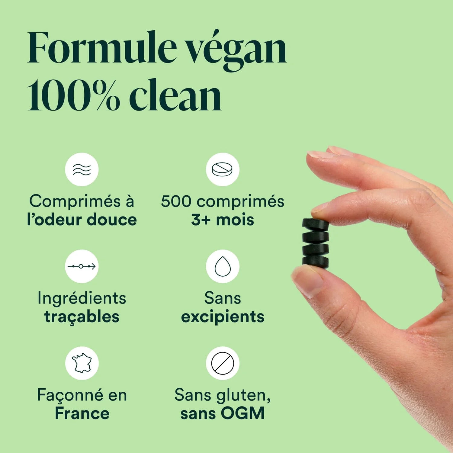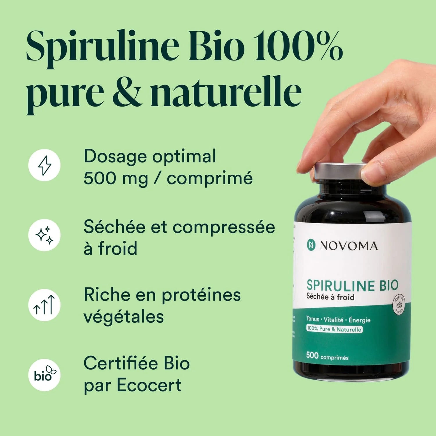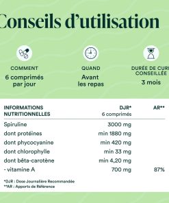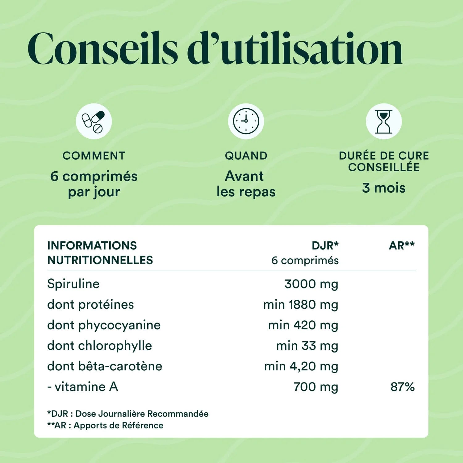 Spiruline Bio 100% pure et naturelle. Séchée et compressée à froid, notre spiruline est riche en protéines végétales, minéraux et vitamines. 16% de Phycocyanine.