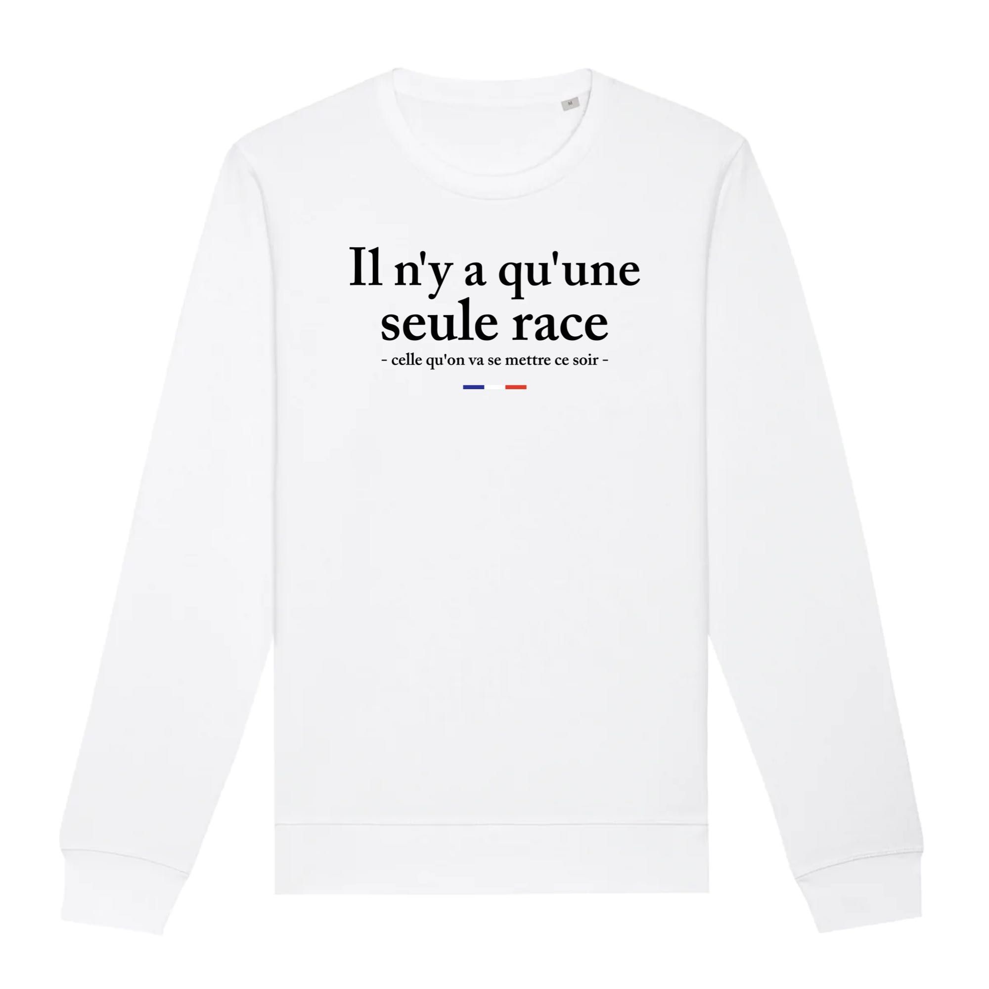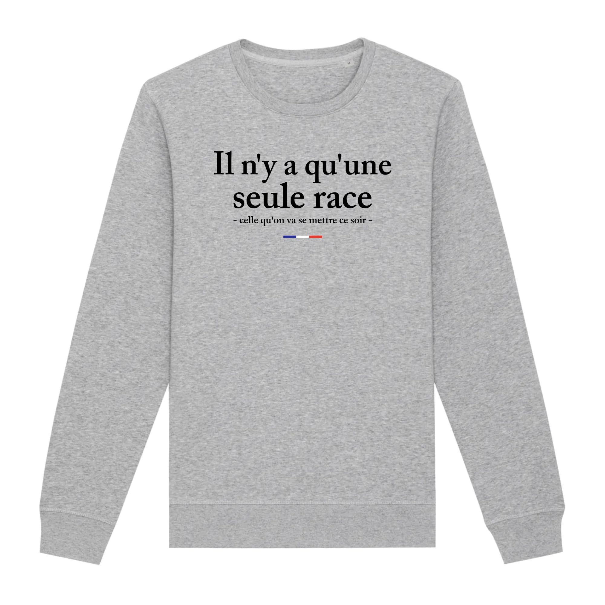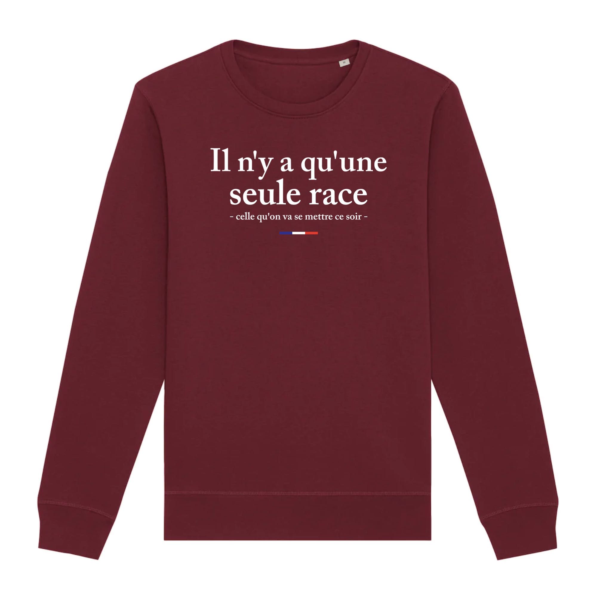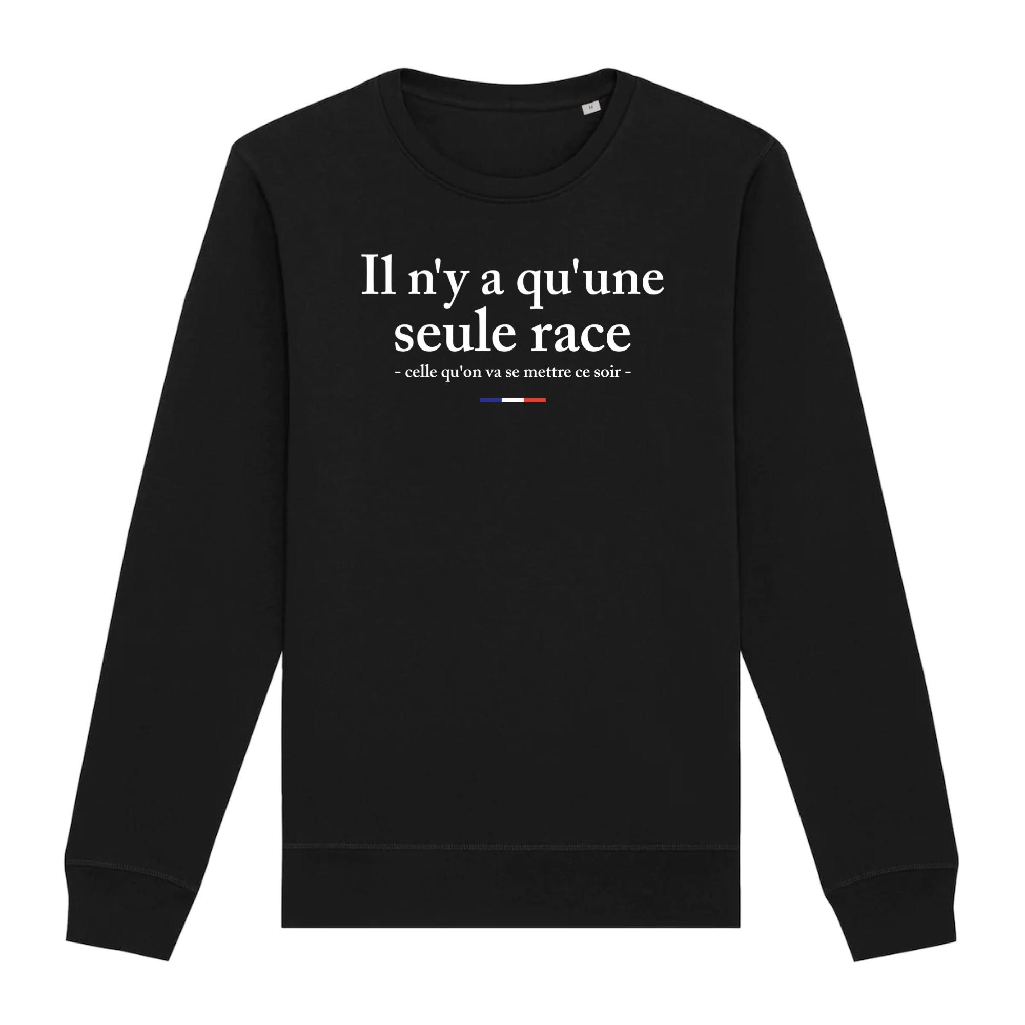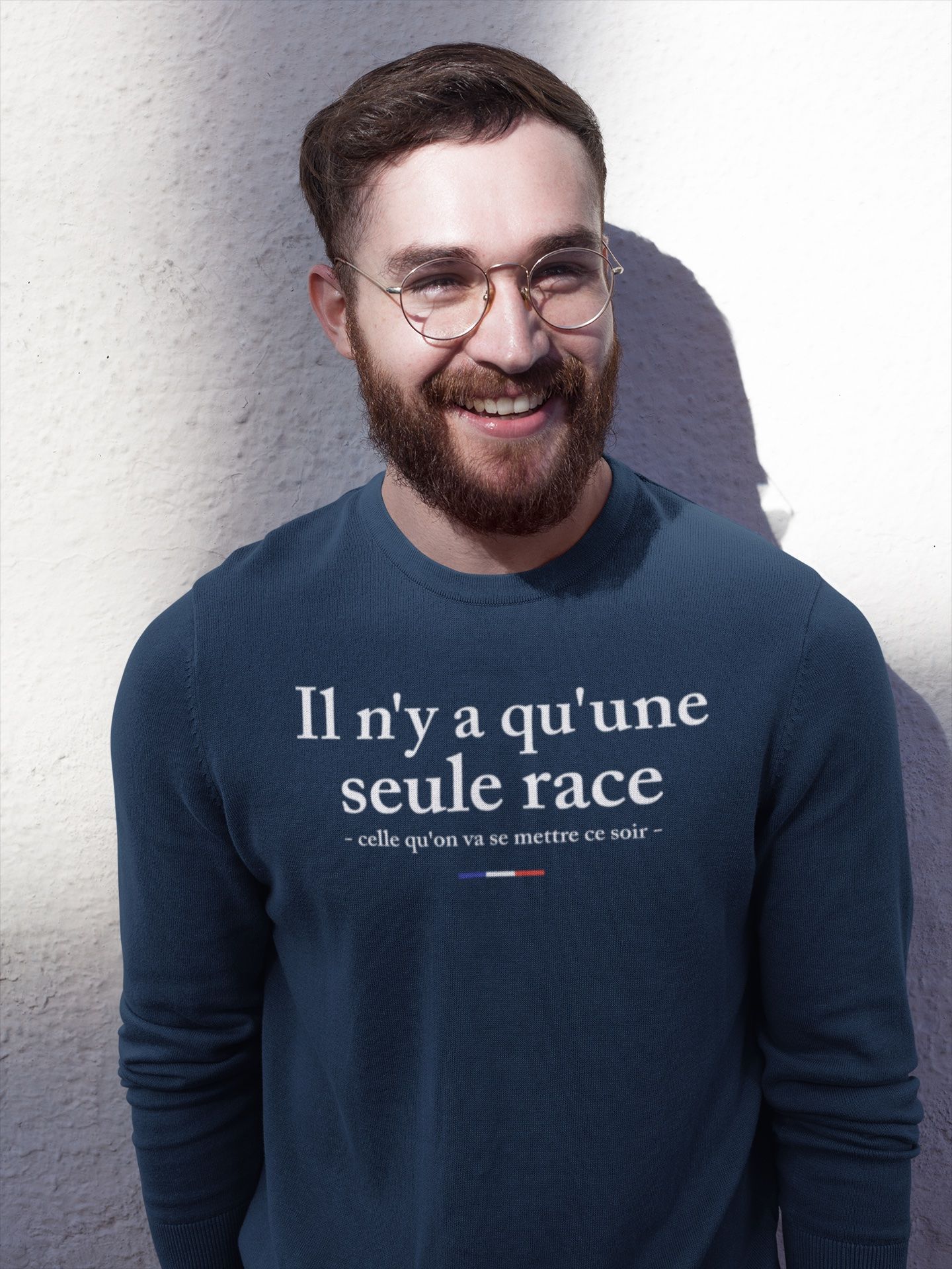 Si vous aimez bien les soirées arrosées, alors ce sweat avec la phrase « Il n’y a qu’une seule race, celle qu’on va se mettre ce soir » est fait pour vous! Pour offrir ou se faire plaisir, ce sweat sera un très bon choix ! Bonne humeur garantie dans vos soirées entre amis 🙂