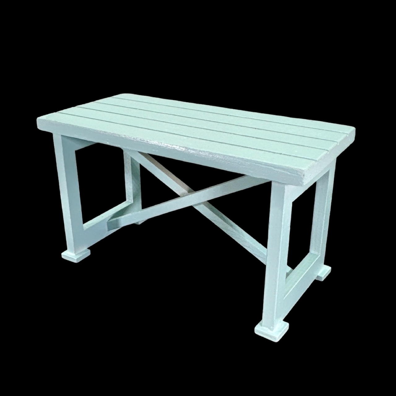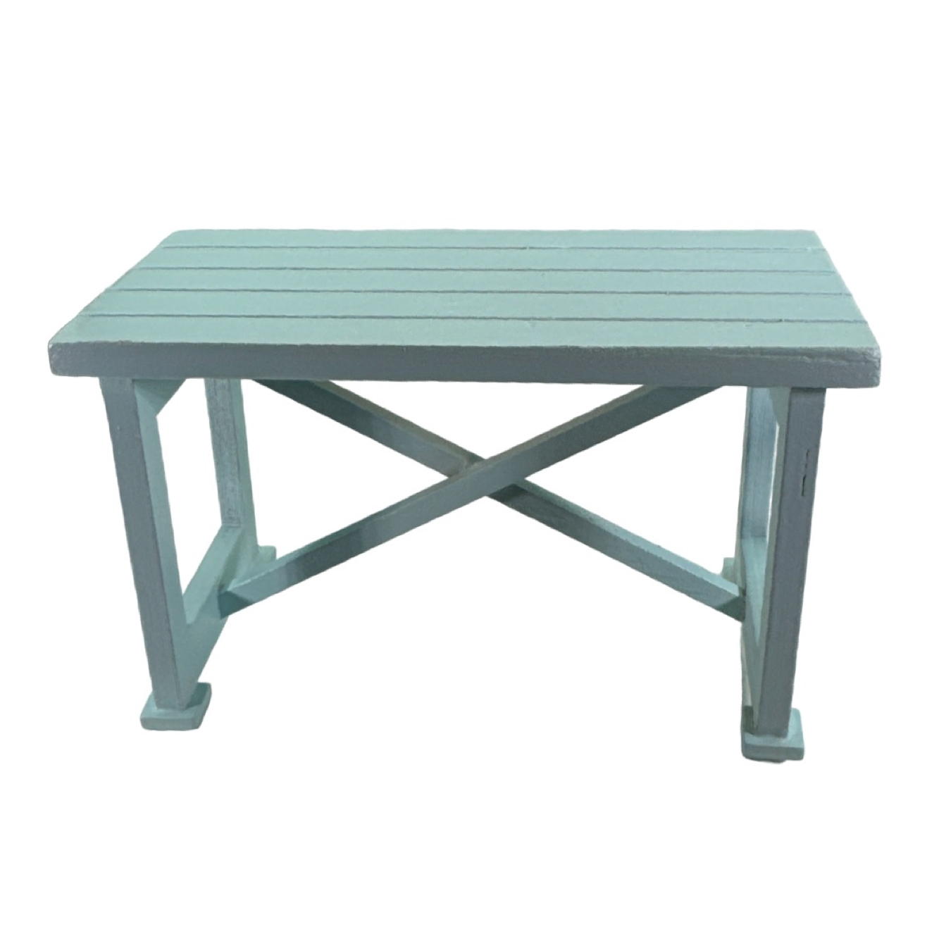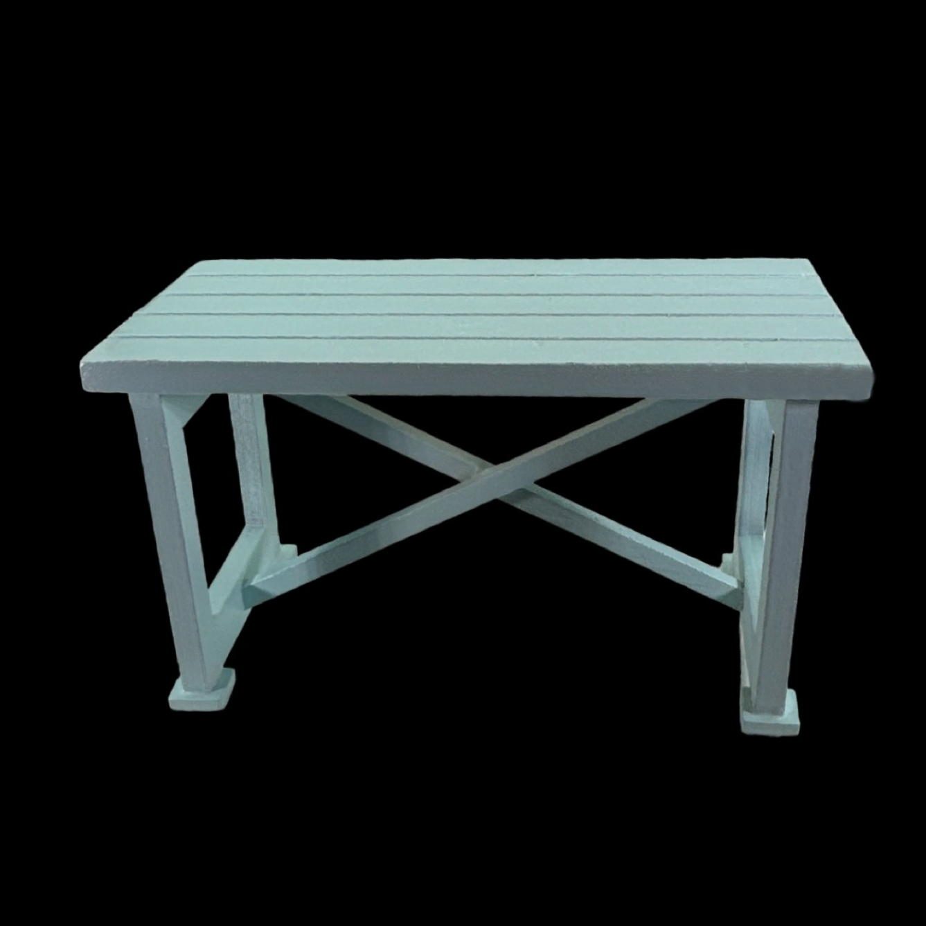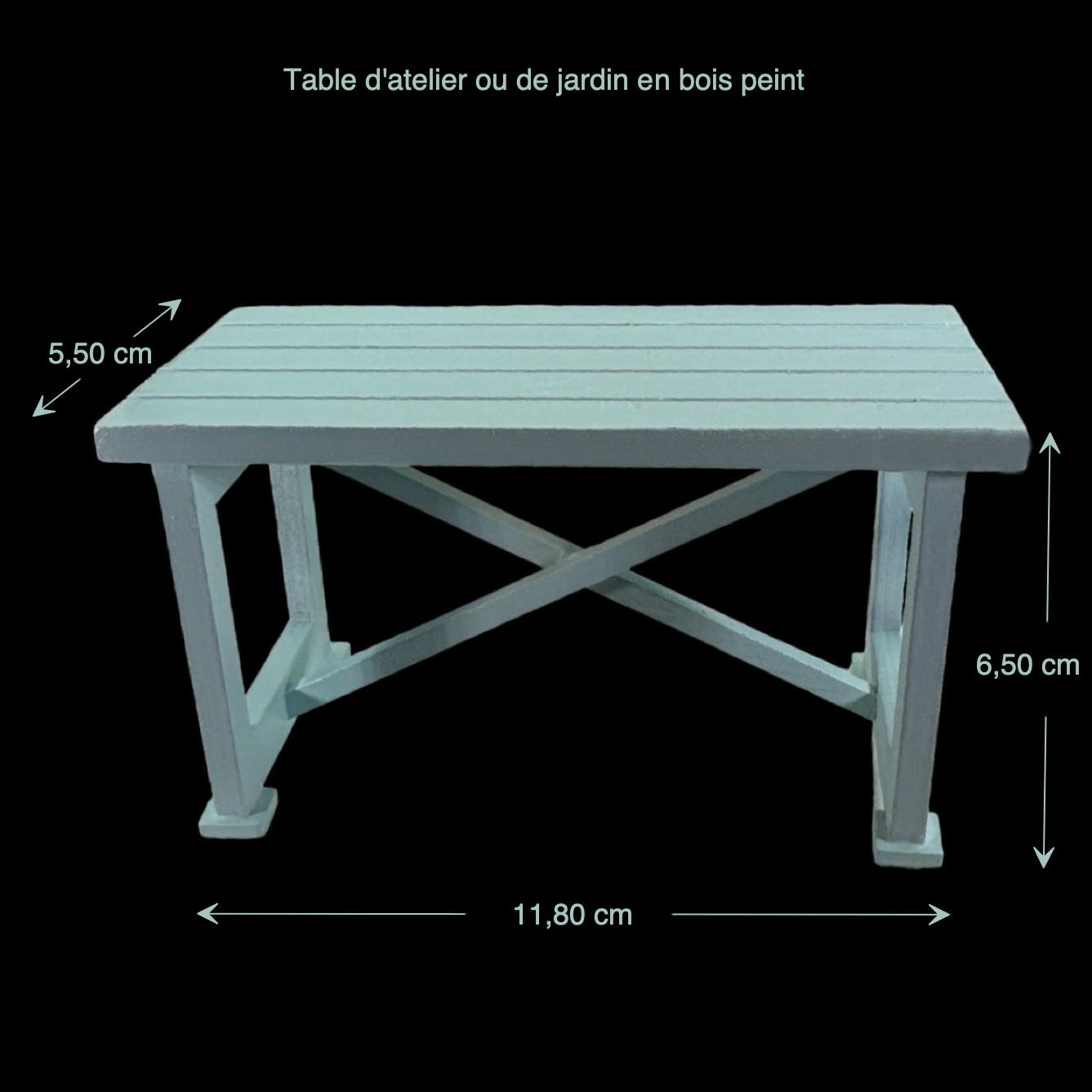 Cette table établi en bois peint est conçue en bois, ce qui garantit une excellente solidité. De plus, son plateau en lattes lui confère une allure à la fois réaliste et artisanale. Par ailleurs, ses pieds renforcés par un croisillon assurent une stabilité parfaite, rendant ce meuble idéal pour un atelier ou un jardin miniature. Enfin, sa peinture bleue apporte une note fraîche et intemporelle, s’intégrant ainsi facilement dans différents styles de décoration miniature.