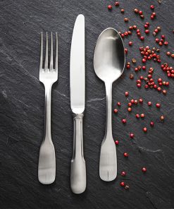 Les couverts VIEUX PARIS SATINÉ de DEGRENNE possèdent une forme traditionnelle qui renvoie à l’atmosphère chaleureuse des bistrots et brasseries françaises. Leur finition satinée se patine avec le temps et en fait un couvert classique idéal au quotidien. Les couteaux existent en manche orfèvre ou en monobloc. Réalisés en acier inoxydable 18%, ces couverts sont faciles d’entretien. Le coffret 24 pièces VIEUX PARIS SATINÉ SATINÉ contient 6 fourchettes de table, 6 couteaux de table monoblocs, 6 cuillère de table et 6 cuillères à café.