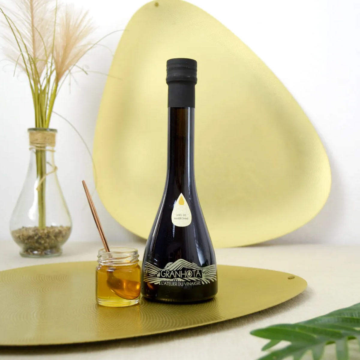 Le Vinaigre au miel de Narbonne Granhota propose une alternative douce et raffinée aux vinaigres classiques. Ce condiment est élaboré à partir d’un vinaigre de vin blanc soigneusement fermenté, auquel est ajouté du miel local récolté dans les environs de Narbonne. Ce mariage unique donne naissance à un vinaigre au nez suave et à la texture soyeuse, parfait pour enrichir vos préparations sans les dominer.