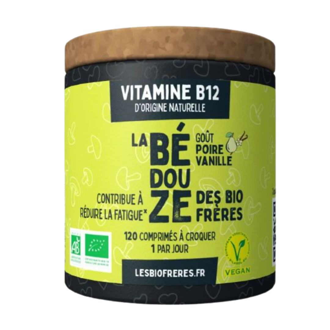 Les Bio Frères Vitamine B12 goût poire-vanille bio est un complément alimentaire certifié bio et vegan, idéal pour soutenir votre vitalité au quotidien. Chaque comprimé à croquer offre une saveur délicieuse de poire et de vanille, rendant la prise agréable. Avec 25 µg de vitamine B12 par comprimé, il contribue à réduire la fatigue, au bon fonctionnement du système nerveux et à la formation normale des globules rouges. Présenté dans un pilulier écologique de 120 comprimés, fabriqué en France, ce produit s’intègre facilement dans votre routine bien-être.