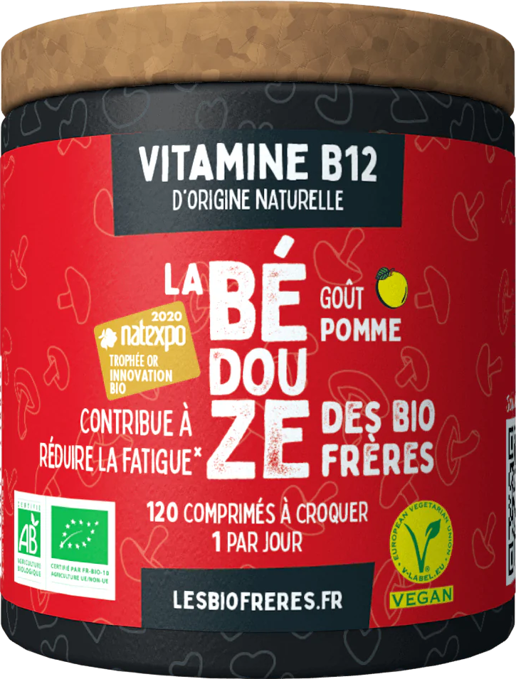 Boostez votre énergie avec la Vitamine B12 goût pomme des Bio Frères. Certifiée bio, elle soutient le fonctionnement du système nerveux et réduit la fatigue. Avec 120 comprimés, profitez d’une supplémentation longue durée et d’un délicieux arôme naturel de pomme. Idéale pour les végans et végétariens, cette vitamine B12 est fabriquée en France dans le respect de l’environnement. Facile à consommer et efficace, elle vous accompagne au quotidien pour un bien-être optimal.