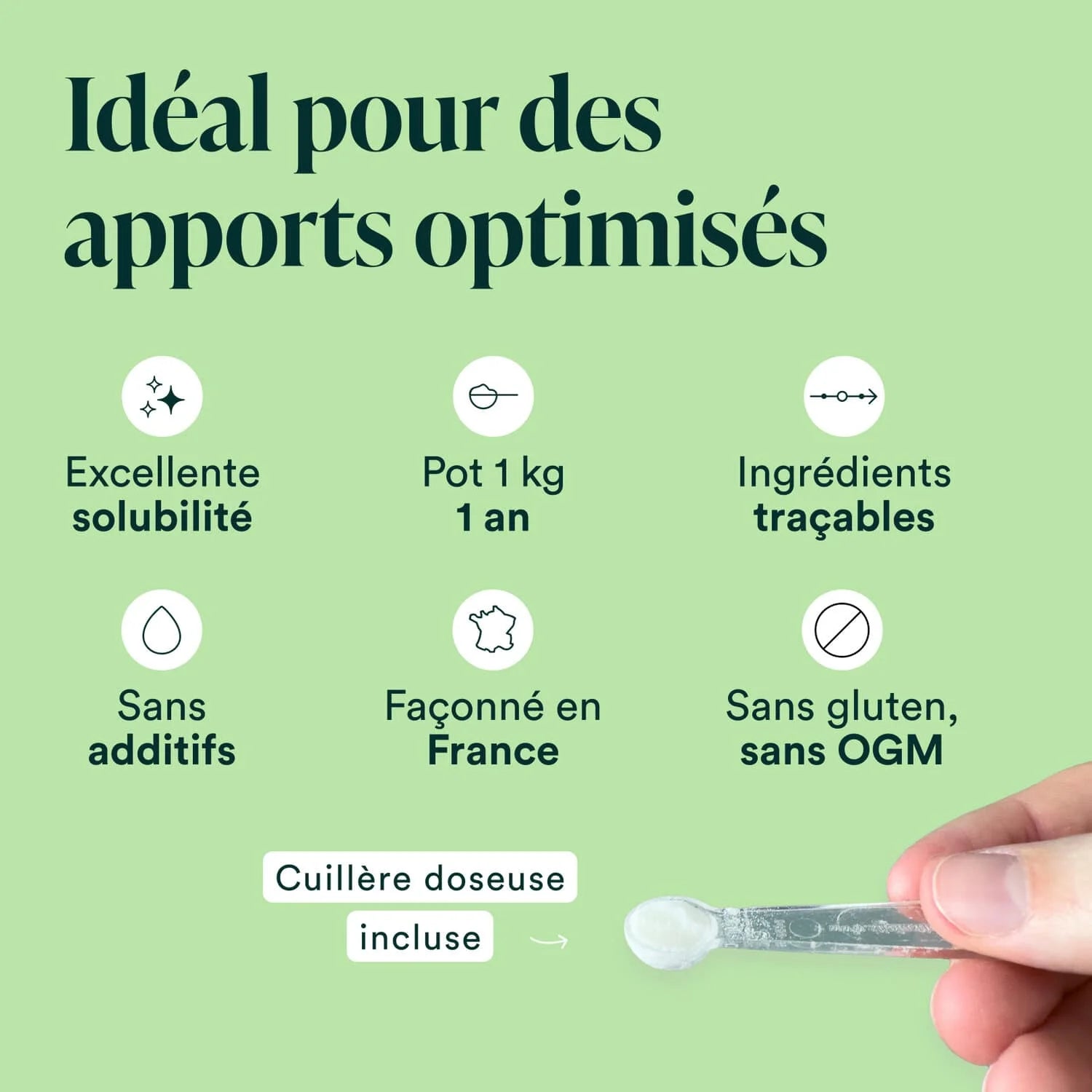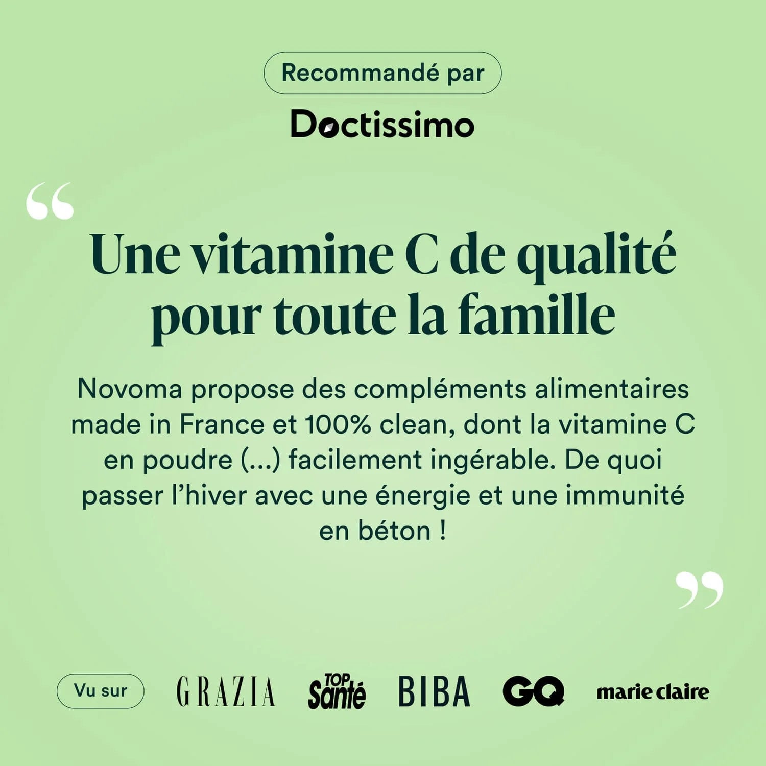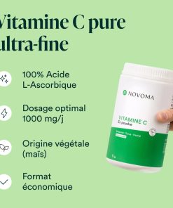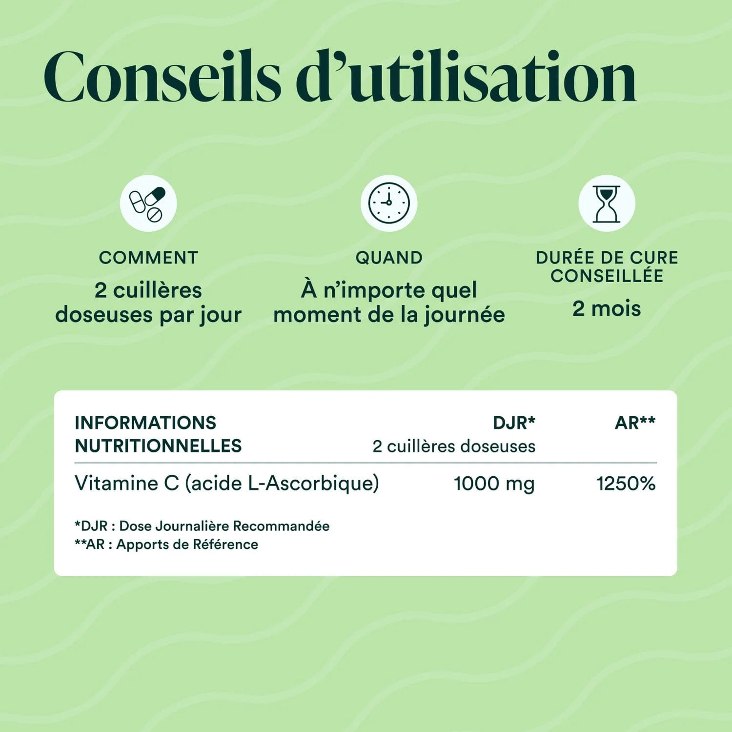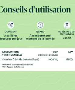 Vitamine C pure en poudre extra soluble d’origine végétale (100% acide L-ascorbique). Cuillère doseuse incluse.