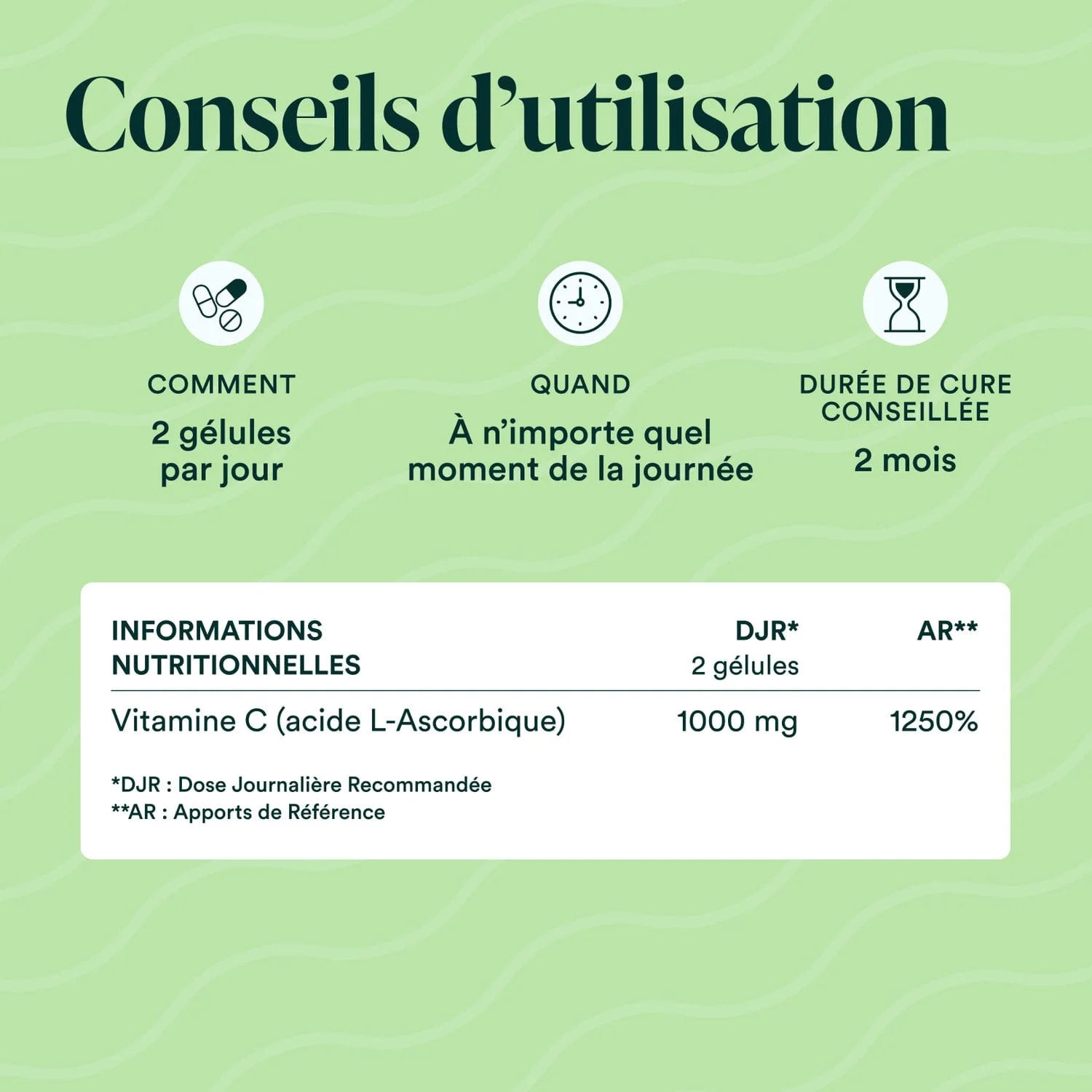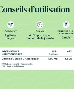 Vitamine C pure brevetée Quali®-C d’origine végétale (100% acide L-ascorbique), dosée à 1000 mg (2 gélules).