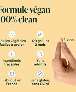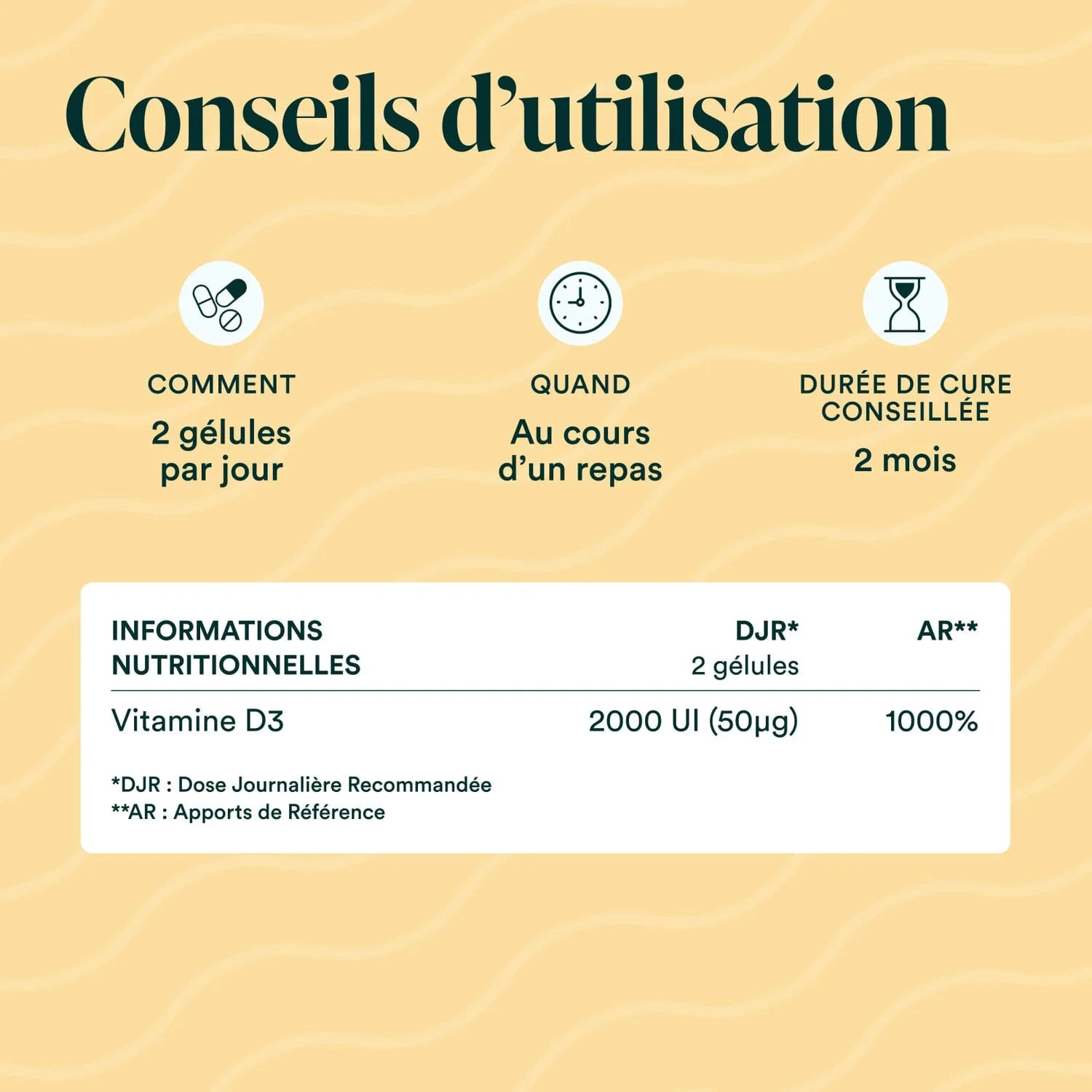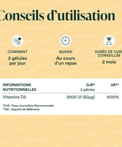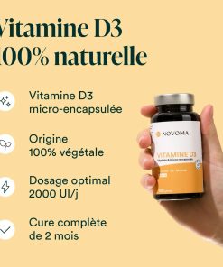 Vitamine D3 100% naturelle et biodisponible : le cholécalciférol. Chaque dose apporte 2000 UI de vitamine D3V® micro-encapsulée d’origine végétale.