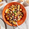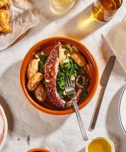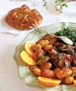 Veau au four mariné 48 heures au vin du Douro et au romarin. Rôti dans un four à pain avec des pommes de terre et oignons. Ce veau est accompagné de pommes de terre au four.