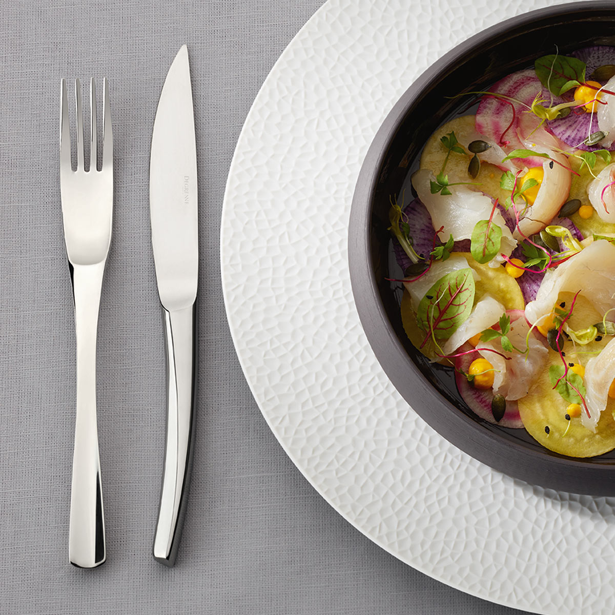 Fidèle à sa dimension créative, DEGRENNE s’est inspiré des tendances culinaires pour créer sa collection de couverts XY. Chaque pièce a été conçue dans ses moindres détail en collaboration avec des chefs reconnus. Bien plus que des couverts, ce sont de véritables outils de dégustation pensés pour sublimer le goût et la texture des aliments. Le design fluide et le raffinement des parties mises en bouche participent à l’élégance de ce modèle. En acier inoxydable 18-10, de haute qualité et résistance, ils sont faciles d’entretien et adaptés à un usage quotidien.
